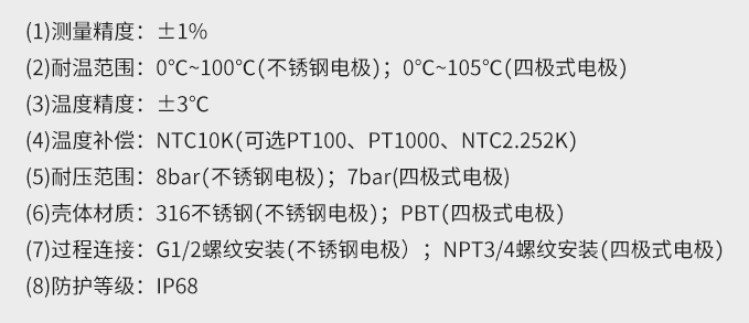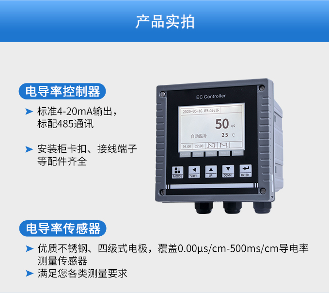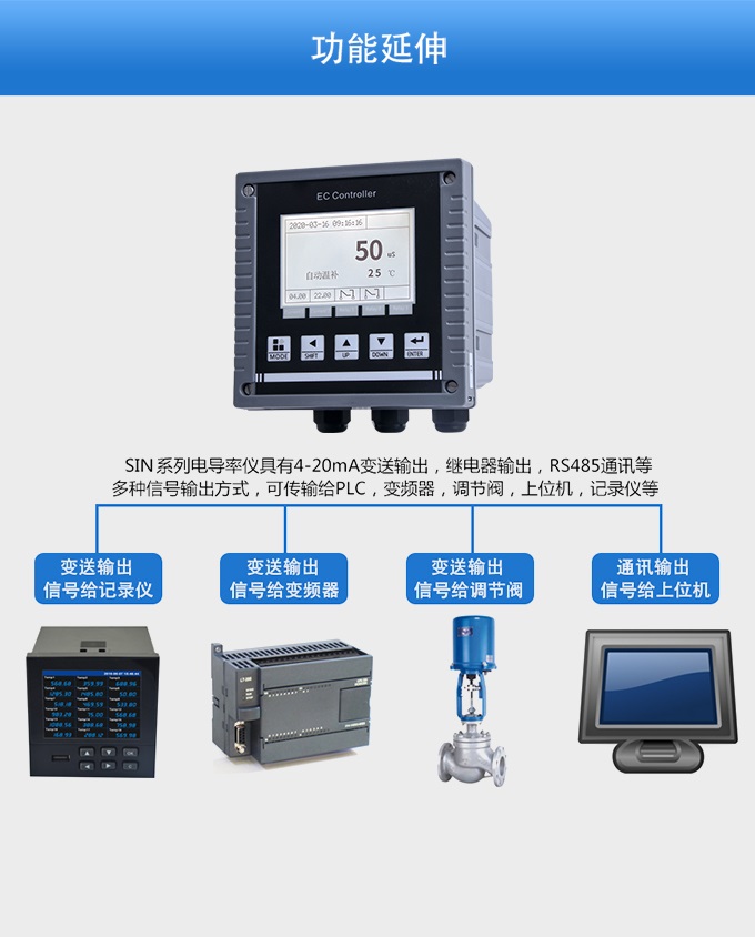 SIN-EC8.0工業(yè)電導率儀表,大屏顯示,可對各種工業(yè)用水的電導率(TDS)值進行連續(xù)測量和控制,本裝置廣泛應用于科學實驗裝備、化工、制藥、環(huán)保、冶金、造紙、食品、飲料及供水等行業(yè)。根據水工業(yè)的環(huán)境和特點結合國際供電標準,考慮了特殊環(huán)境的電氣設計規(guī)范,增加了220VAC供電。
