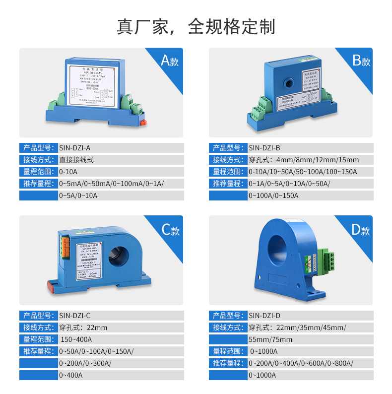 電流變送器可以直接將被測(cè)主回路交流電流或者直流電流轉(zhuǎn)換成按線(xiàn)性比例輸出的DC4~20mA(通過(guò)250Ω 電阻轉(zhuǎn)換DC 1~5V或通過(guò)500Ω電阻 轉(zhuǎn)換DC2~10V)恒流環(huán)標(biāo)準(zhǔn)信號(hào),連續(xù)輸送到接收裝置(計(jì)算機(jī)或顯示儀表)。