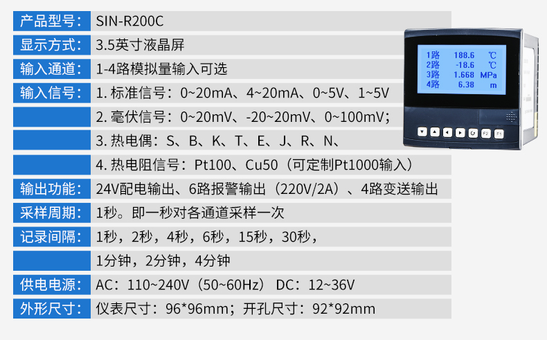 SIN-R200C顯示采用 3.5 英寸 高分辯率點(diǎn)陣式白屏黑字液晶屏,軟件上引入中文WINDOWS 的框架思路,并采用了數(shù)據(jù)壓縮技術(shù)。帶 USB 數(shù)據(jù)轉(zhuǎn)存功能,存儲時間最長可達(dá) 720 天。儀表全面采用了表面貼裝工藝,并采用多保護(hù)和隔離設(shè)計,抗干擾能力強(qiáng),可靠性高。儀表可同時輸入 4 路萬能信號,輸入通道相互隔離,并具有報警控制、模擬變送、RS485/232 通訊等輸出功能,是一款功能齊全的漢顯儀。