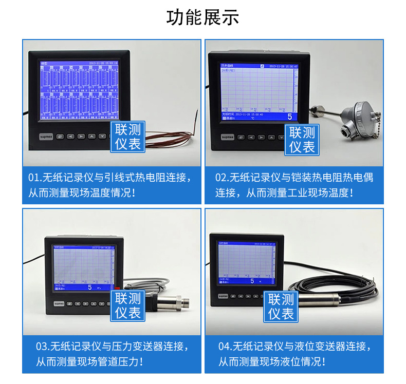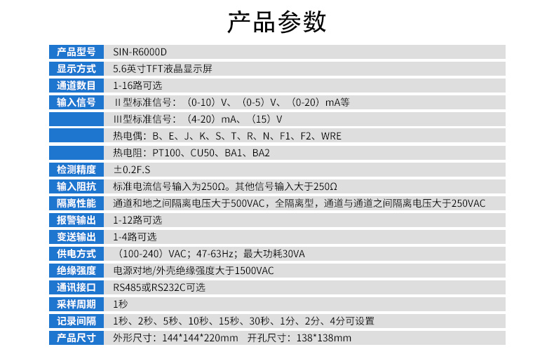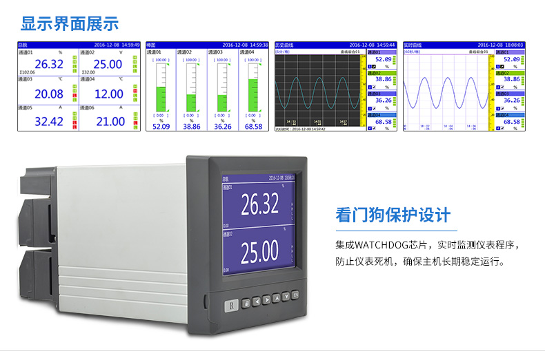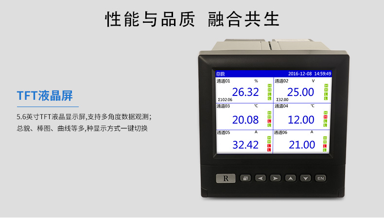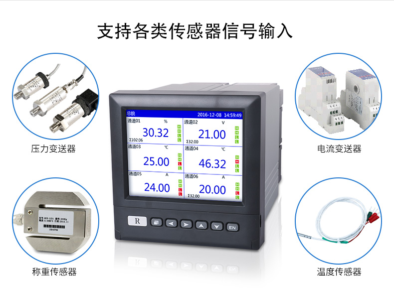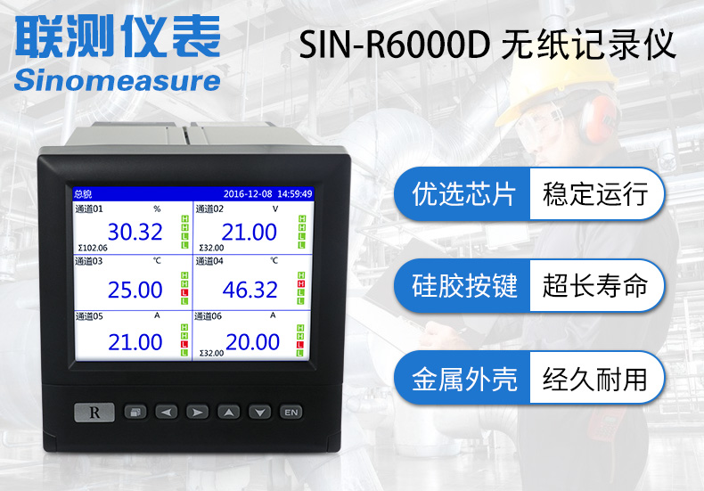 SIN-R6000D系列無紙記錄儀是一種高速高性能微處理器和5.6英寸彩色液晶顯示屏,對現(xiàn)場各種溫度、壓力、流量、電量等信號實現(xiàn)監(jiān)測、控制和記錄功能。 SIN-R6000D系列無紙記錄儀可自由組態(tài)輸入標準電流、標準電壓、熱電偶、熱電阻、頻率等信號,可實現(xiàn)為傳感器配電和繼電器報警輸出,并且可通過U盤或通訊方式與上位機進行數(shù)據(jù)交換。