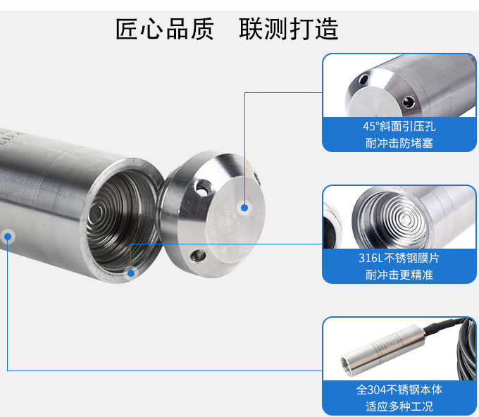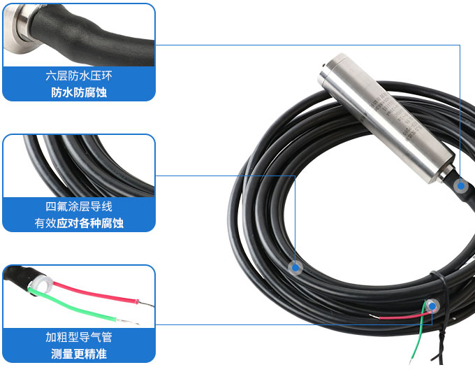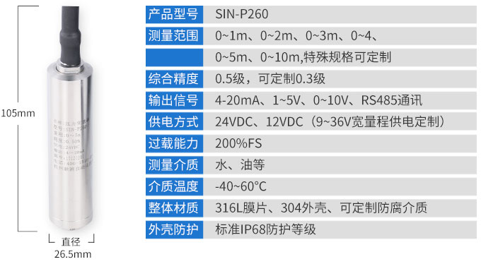SIN-P260投入式液位變送器由高性能擴(kuò)散硅壓阻式壓力傳感器作為測量元件,把與液位深度成正比的液體靜壓力準(zhǔn)確測量出來,并經(jīng)過信號調(diào)理電路轉(zhuǎn)換成標(biāo)準(zhǔn)(電流或電壓)信號輸出,建立起輸出信號與液體深度的線性對應(yīng)關(guān)系,實(shí)現(xiàn)對液體深度的測量。